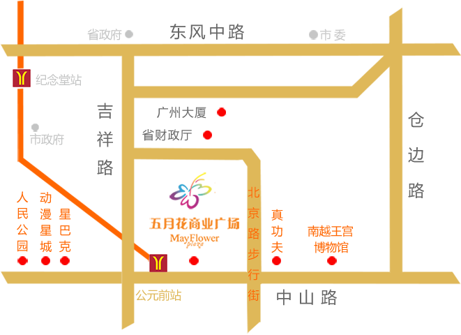 五月花商业广场为广州捷丽置业有限公司开发之物业项目,项目位于广州最繁华的北京路黄金商圈心脏地带,雄踞北京路和中山五路交汇点,紧邻解放路,背靠东风路,市区各一级主干道如纽带紧紧围绕四周,数十条公交线路也在五月花门前汇聚,市内各区瞬间直达。是齐集购物、娱乐、饮食和休闲等多种消费形式于一身的大型综合式购物商厦。